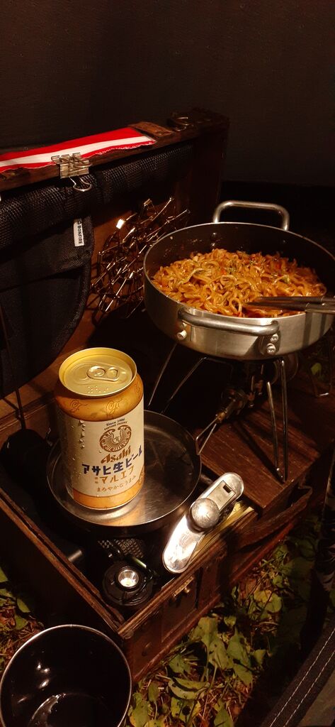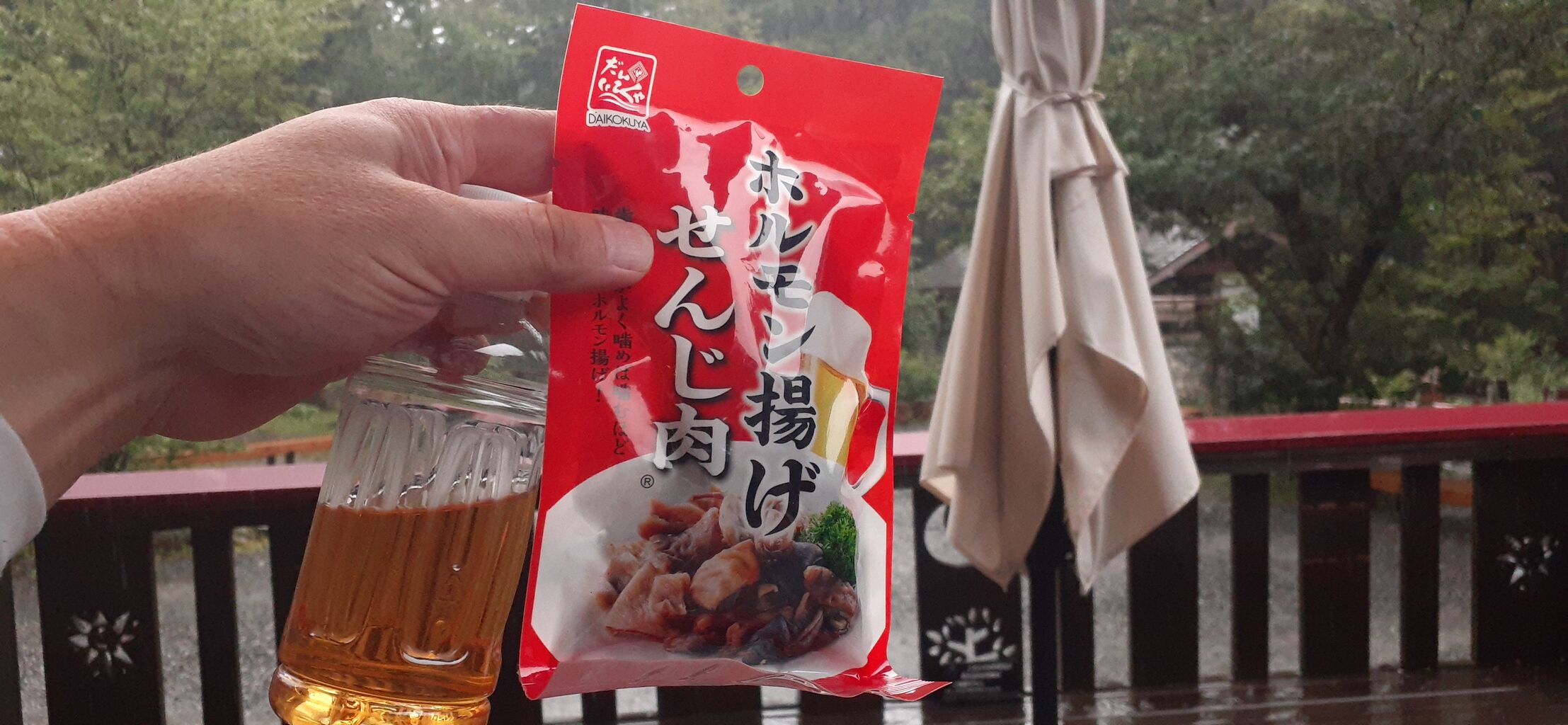 コイツと、どこぞのスーパーで売ってた「せんじ肉」(関西ではカス、広島ではせんじがら)をアテに、カフェの軒下で立呑みを始めた。