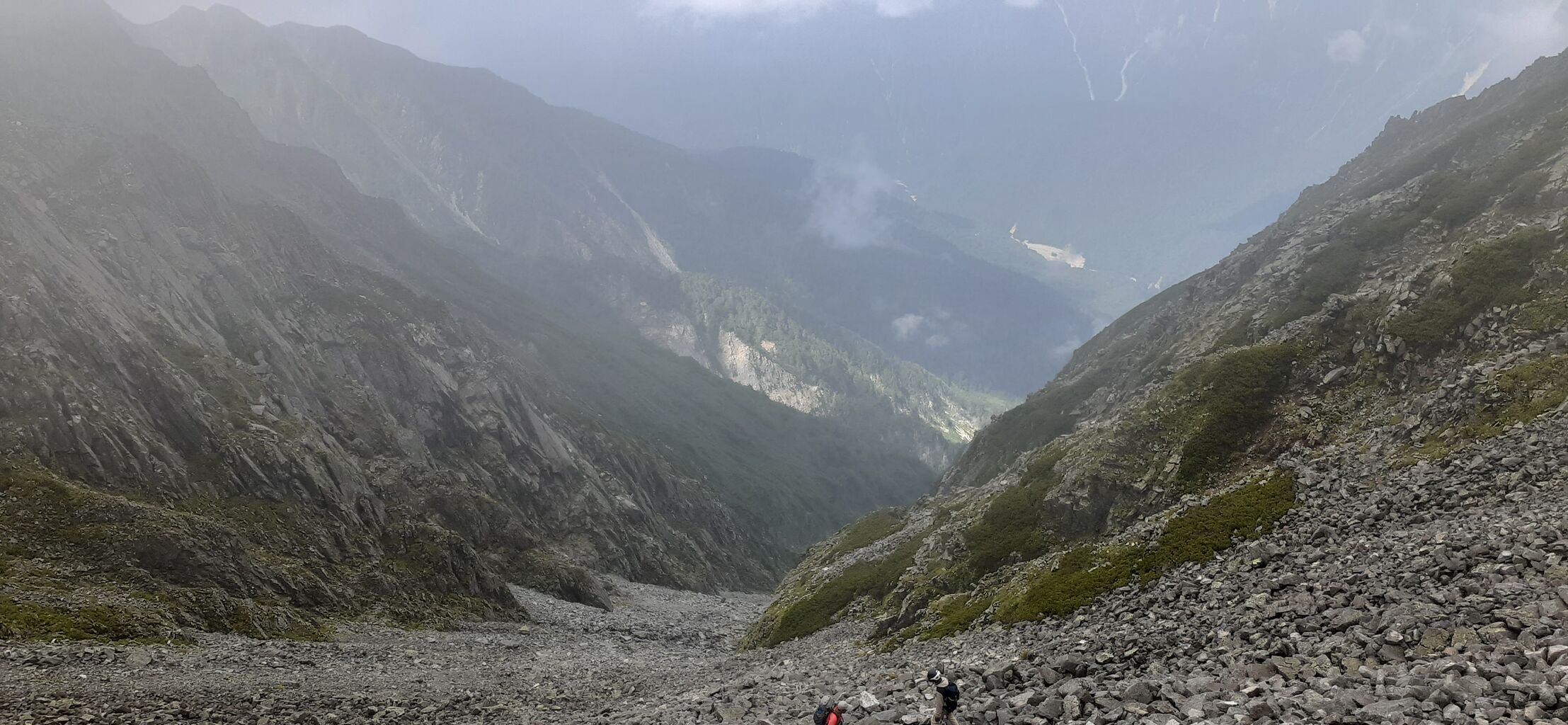涸沢小屋の裏から登り始め、低木の森を抜けた。