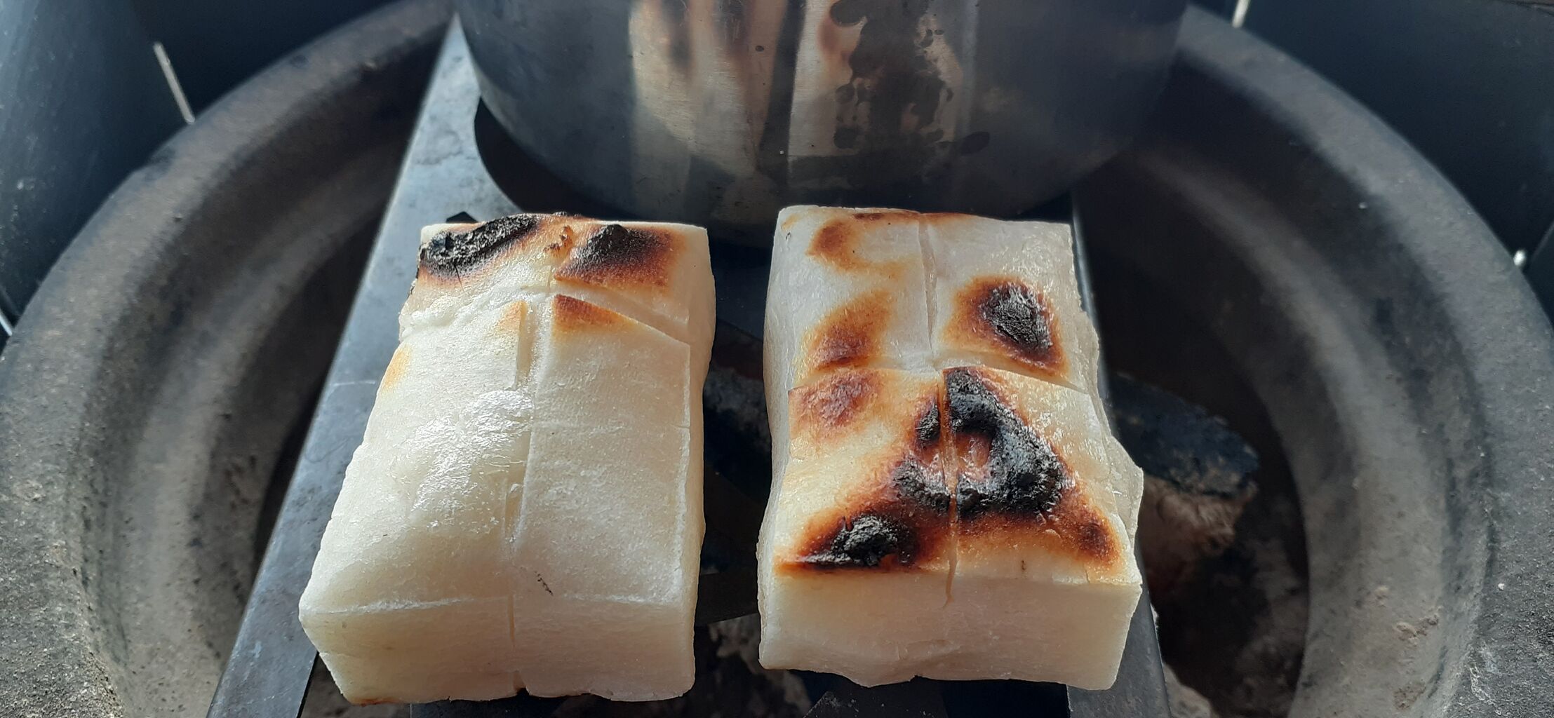 卓上の七輪で、特製タレに漬けた地鶏を焼きます。