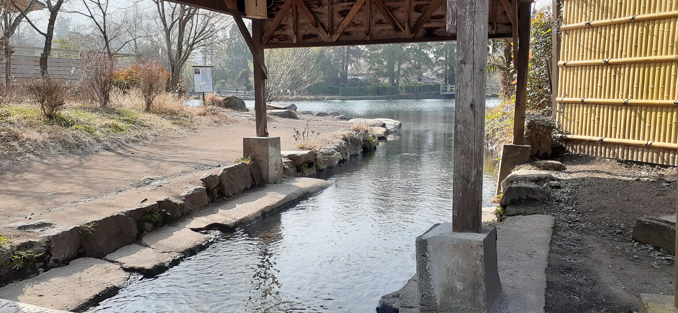 外には足湯が出来る川があり、金鱗湖に流れ込んでいる。