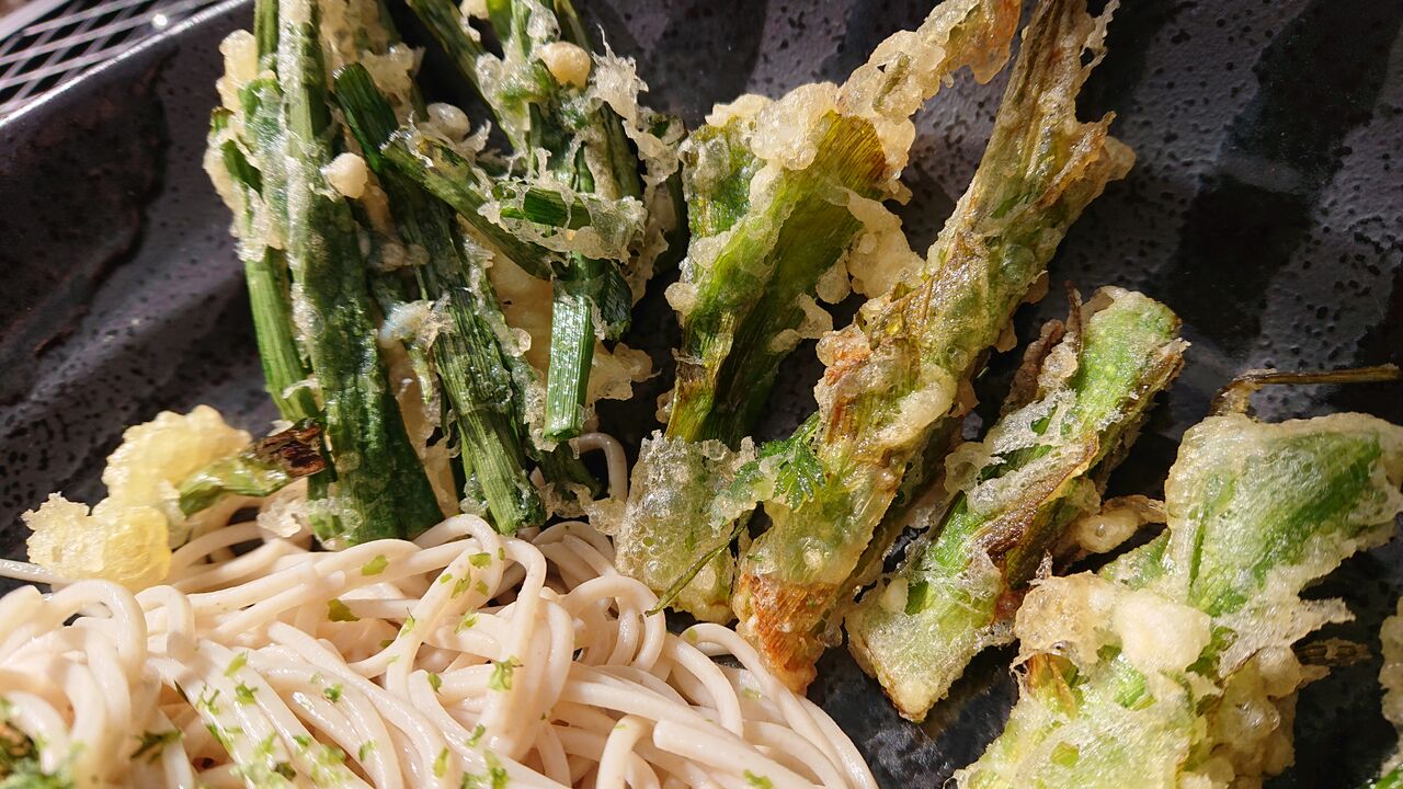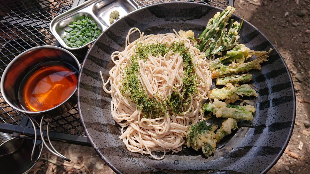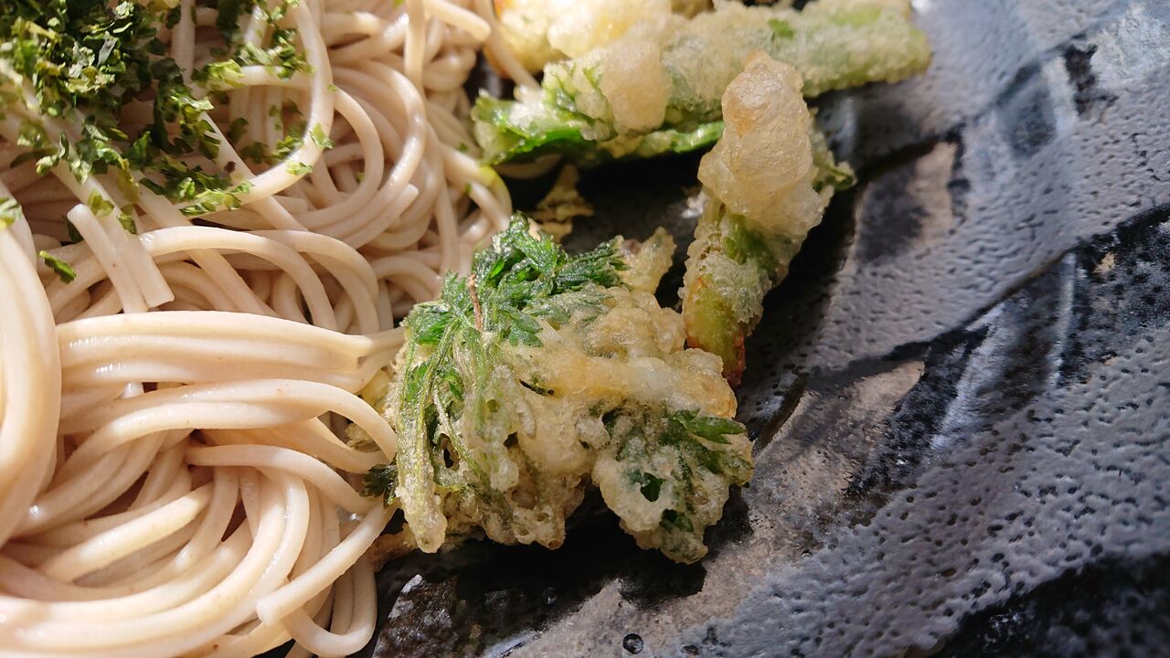 蕎麦、めんつゆ、ワサビ、ネギ、小麦粉30g、片栗粉3g、水33ml、玉子半分、野草、青海苔
