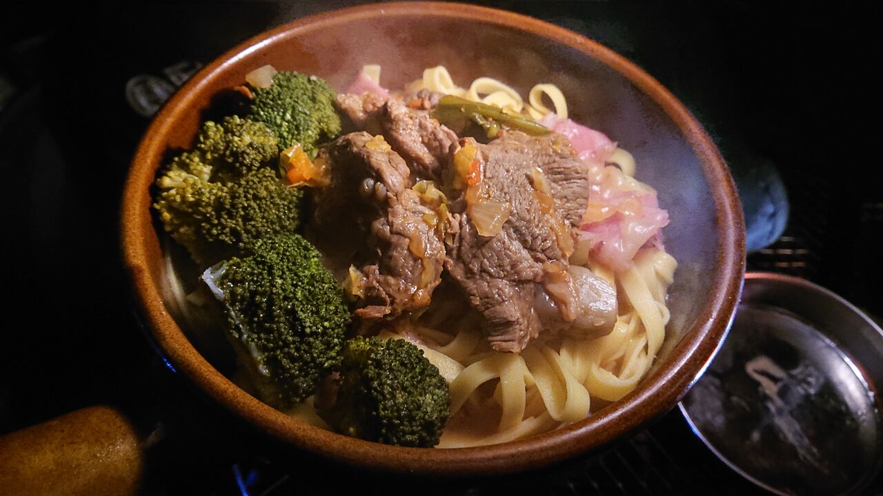前日から牛筋肉とニンニクをクツクツと煮込んでいたので、そいつをベースにする。