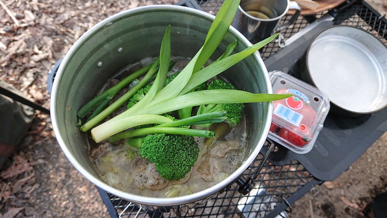 ⑤白ワイン、ブイヨン、牛筋スープを入れて、ブロッコリーと煮込む