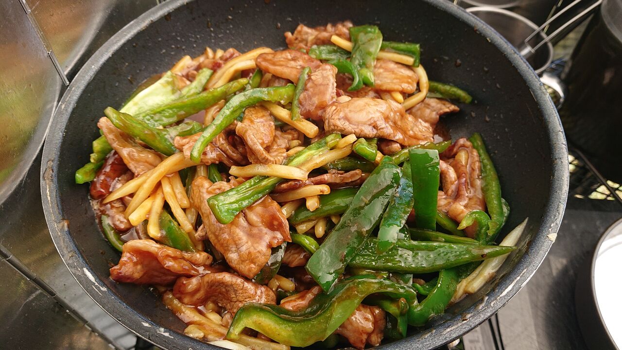 ⑤青椒肉絲の素と、炒めたピーマンとタケノコを加えて、混ぜながら炒める