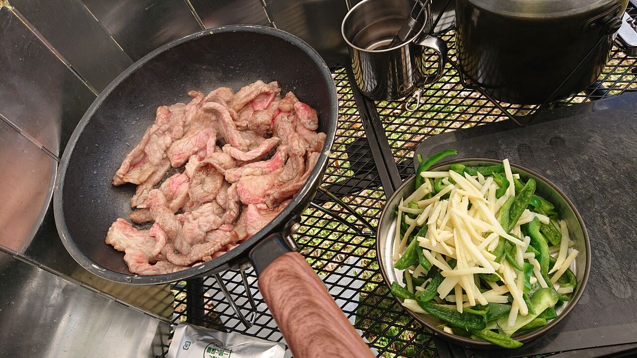 ③牛脂をフライパンで熱して、ピーマンとタケノコを炒める