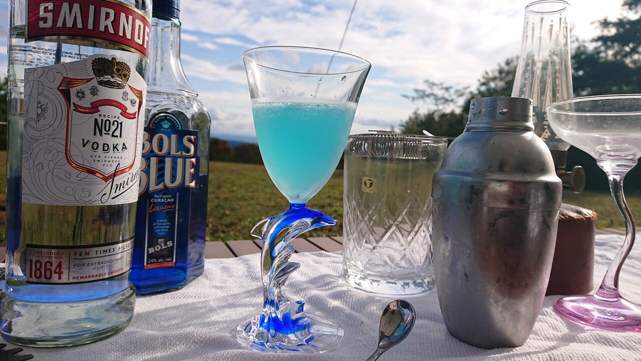 ①シェイカーにウォッカ3、ブルーキュラソー1、レモンジュース