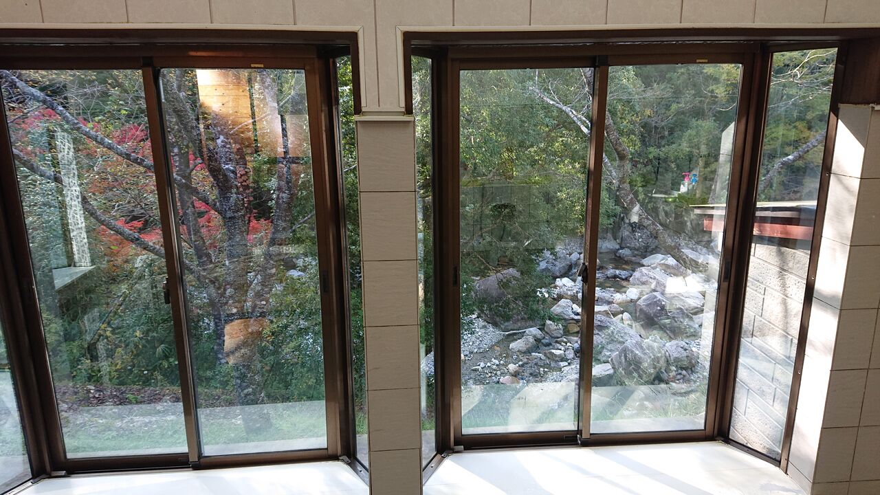 窓から渓谷が眺められるが、露天風呂が無いのが残念だ。