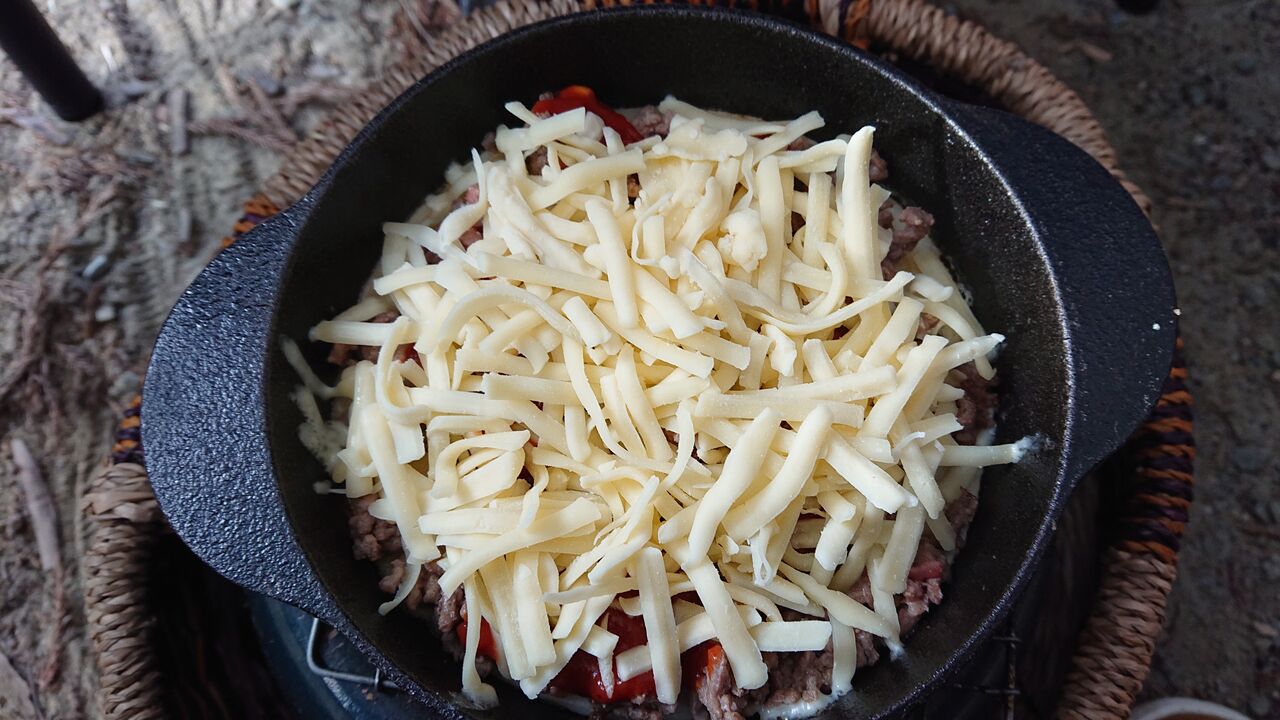 小麦粉50g、水100ml、豚牛合挽き肉、モッツァレラチーズ、ピザソース、歌瀬スパイス