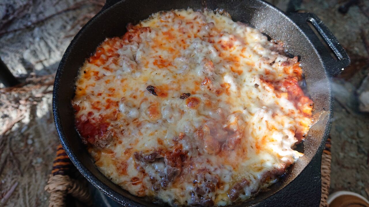 鉄蓋付きのスキレットなので、蓋に炭を乗せれば上面からの加熱が出来る。