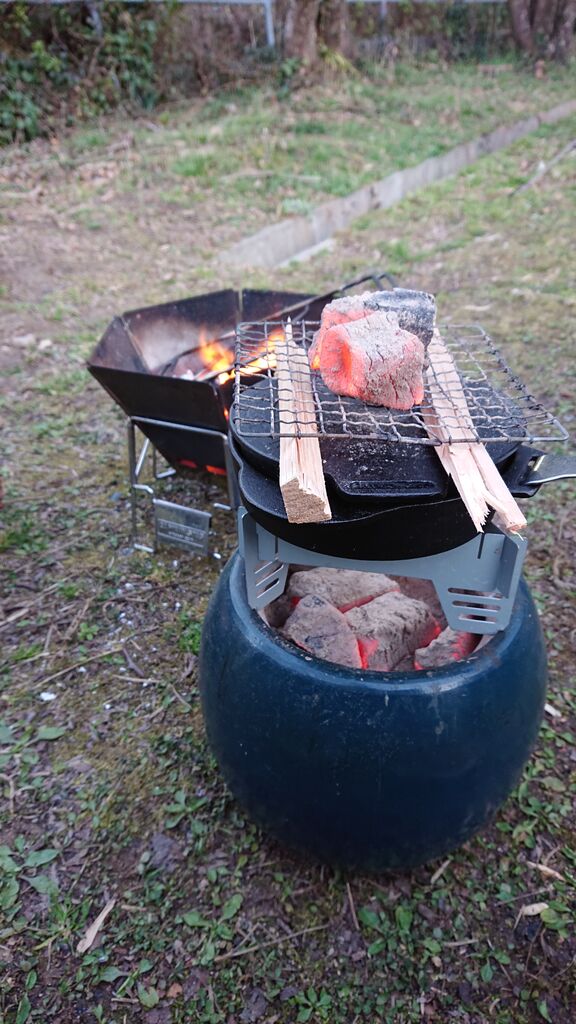 火鉢とスキレットを使用して低温加熱。じっくり火を通す。