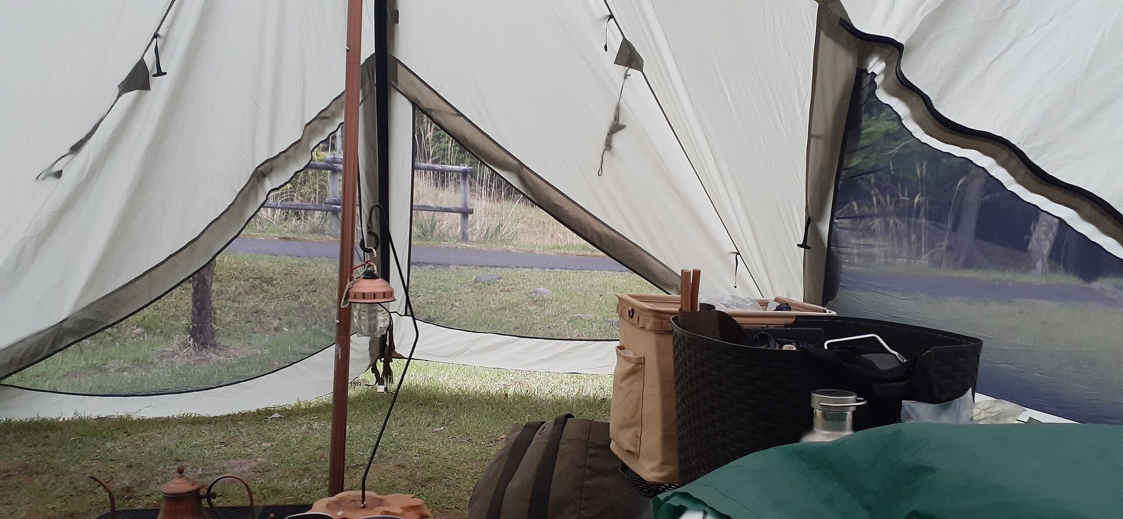 幕内のポールにベルトを渡して、濡れものの物干しも作った。