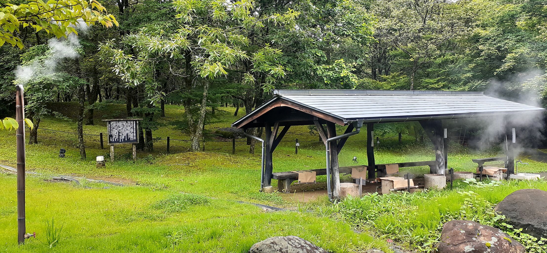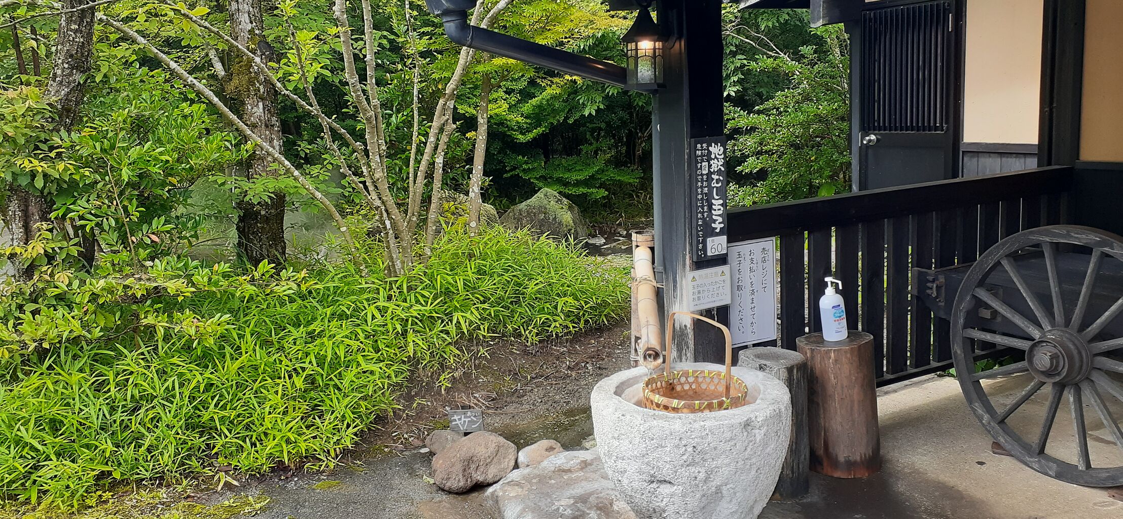 駐車場の前に地獄蒸しの釜が並んでいた。