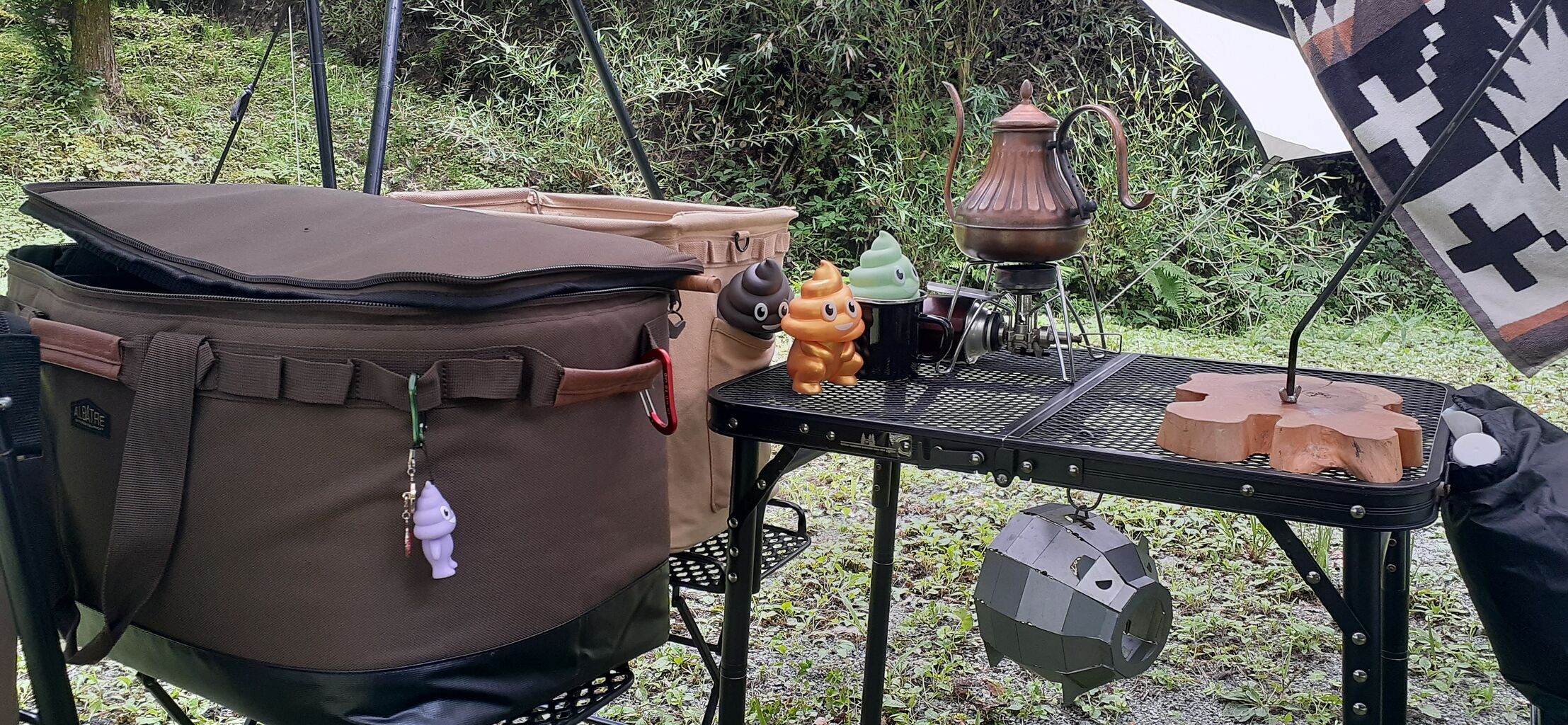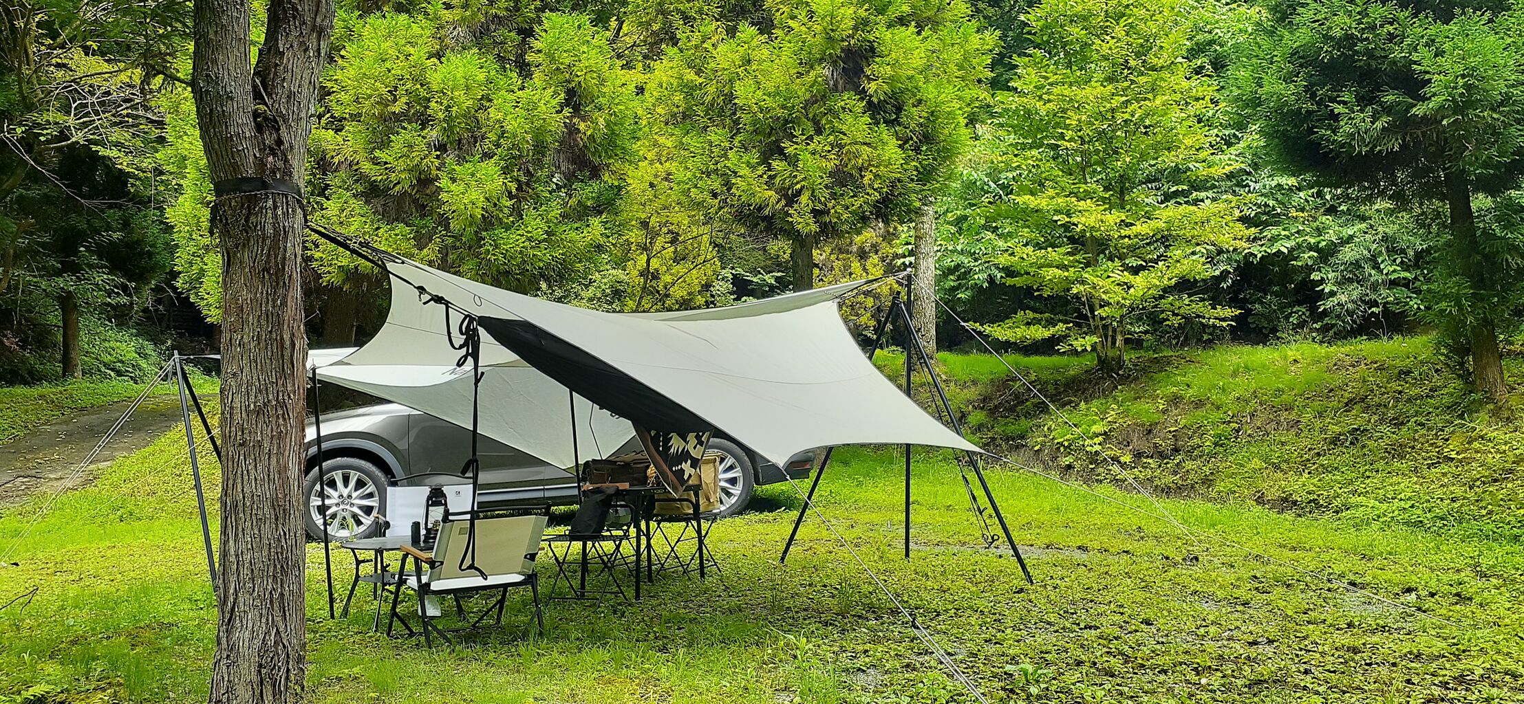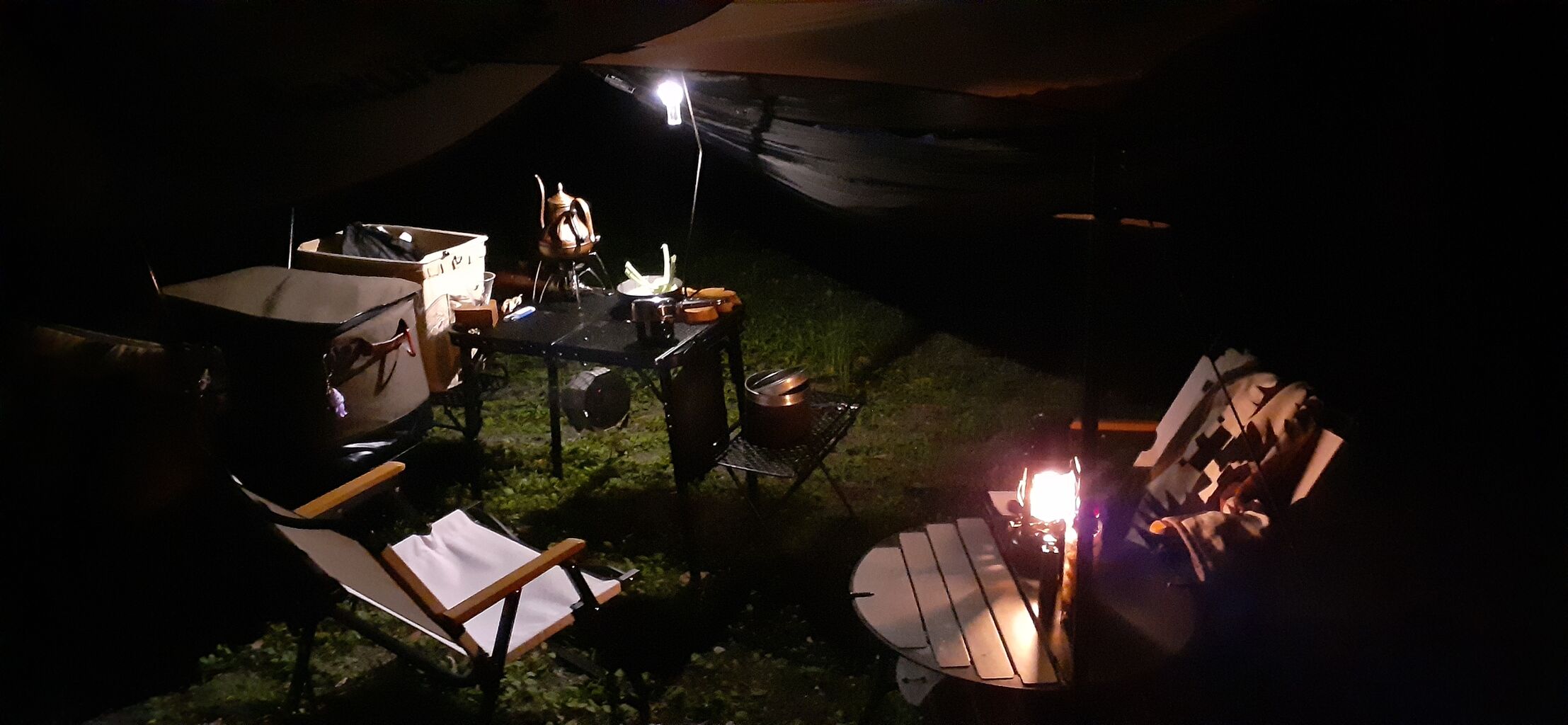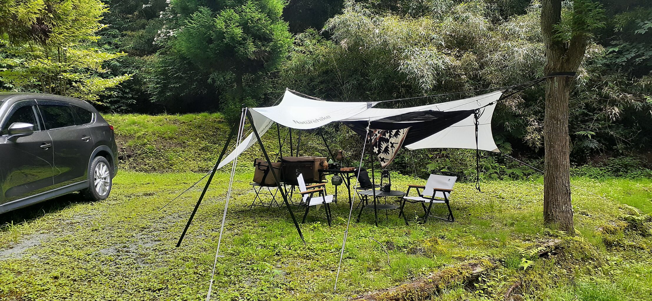 ちょいちょい雨が降ったので、タープが濡れてます。
