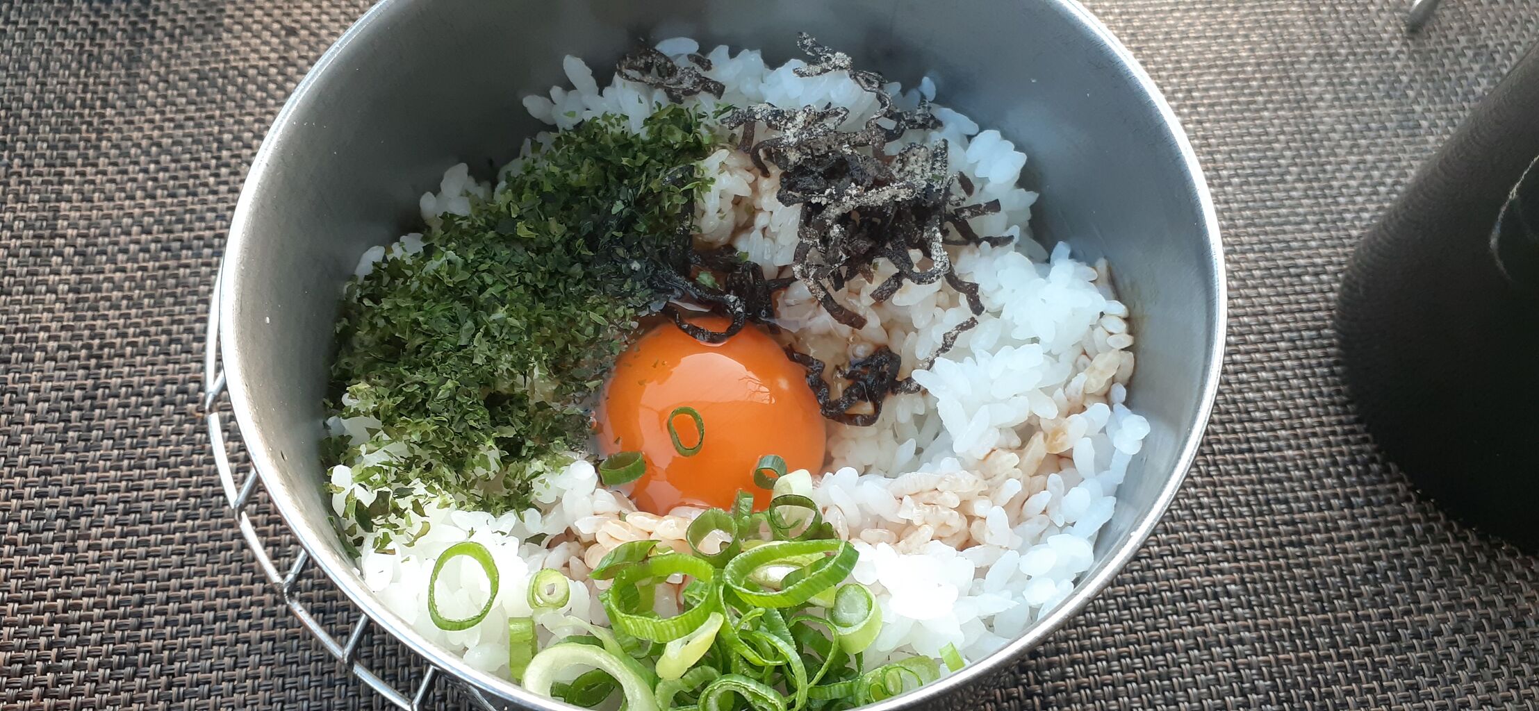 ⑥ご飯に玉子、青海苔、塩昆布、醤油を入れて混ぜる