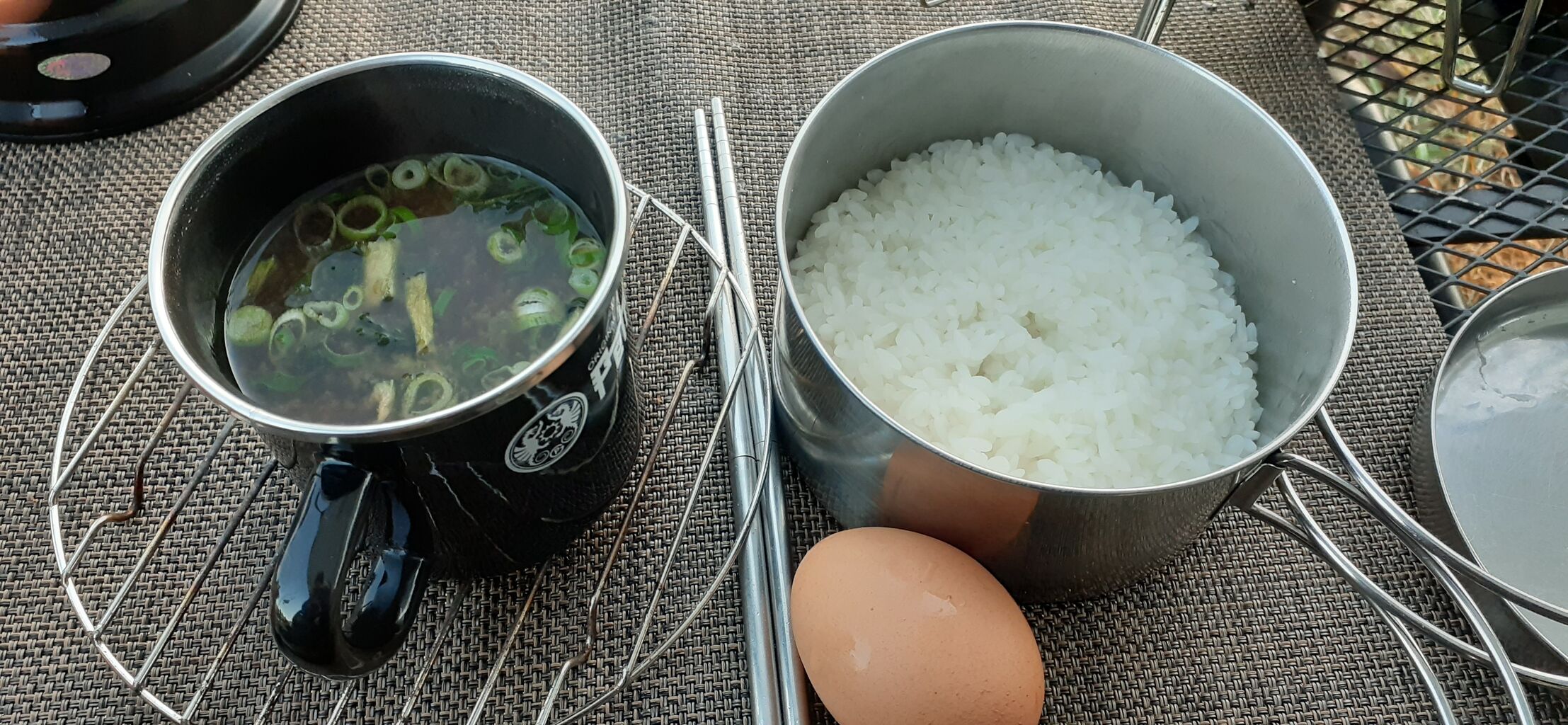 ④味噌汁の素、乾燥小松菜、葱をカップに入れてお湯を注ぐ