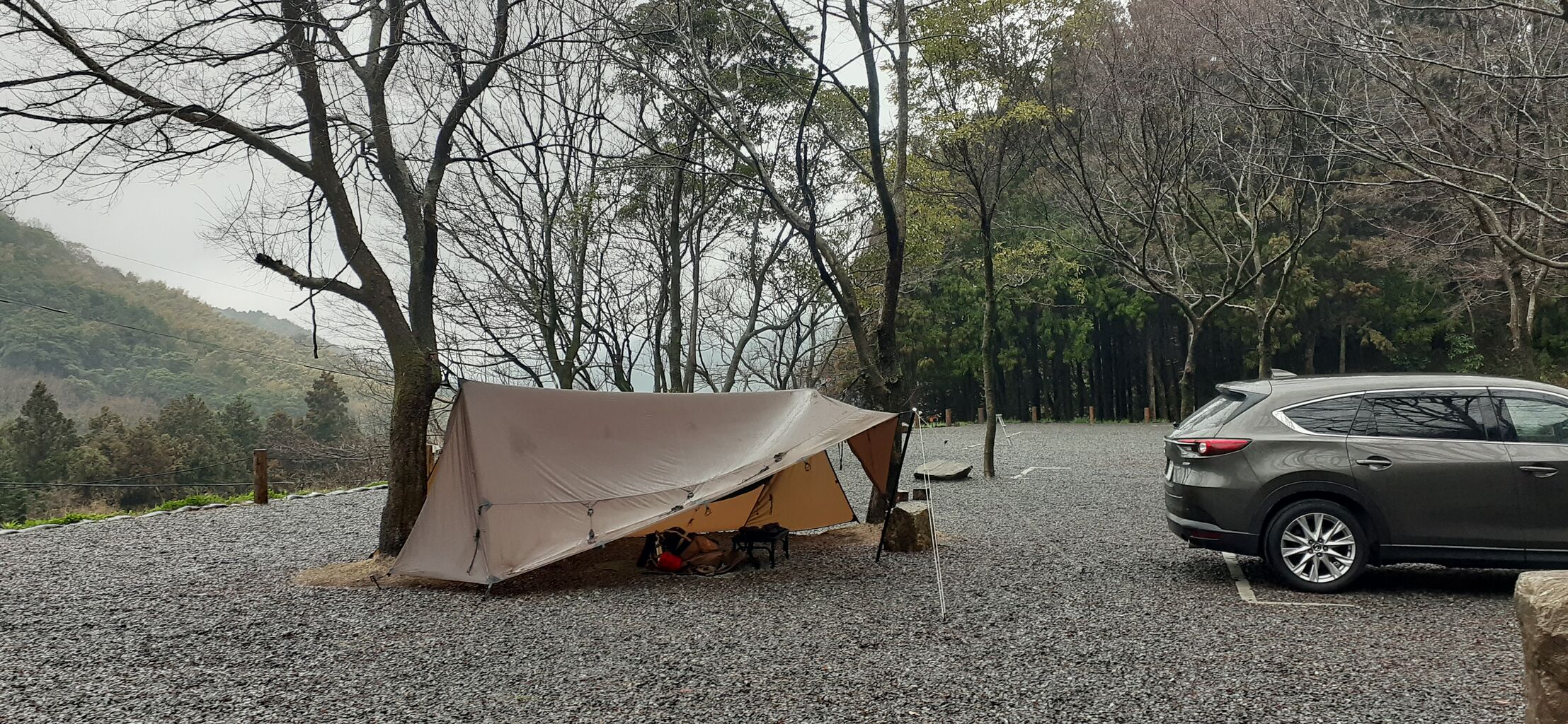 木とエイトたんのリアハッチのダンパーに、リッジラインを結び付け、muraco オクタ4を張れば屋根完成。