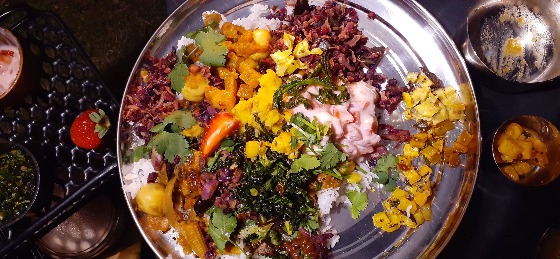 ・タラの芽の素揚げ、パクチー、あまおう