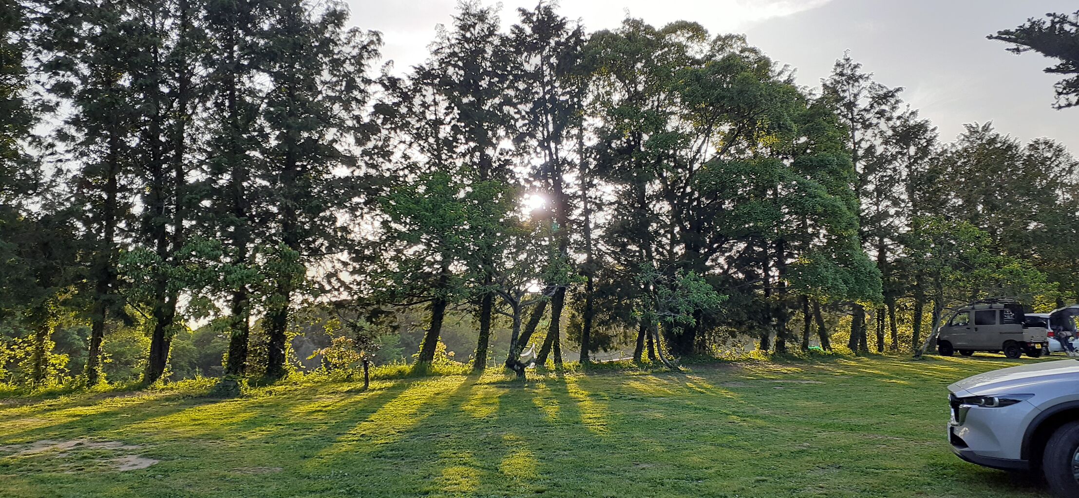 地面の緑に映る木漏れ日が綺麗です。